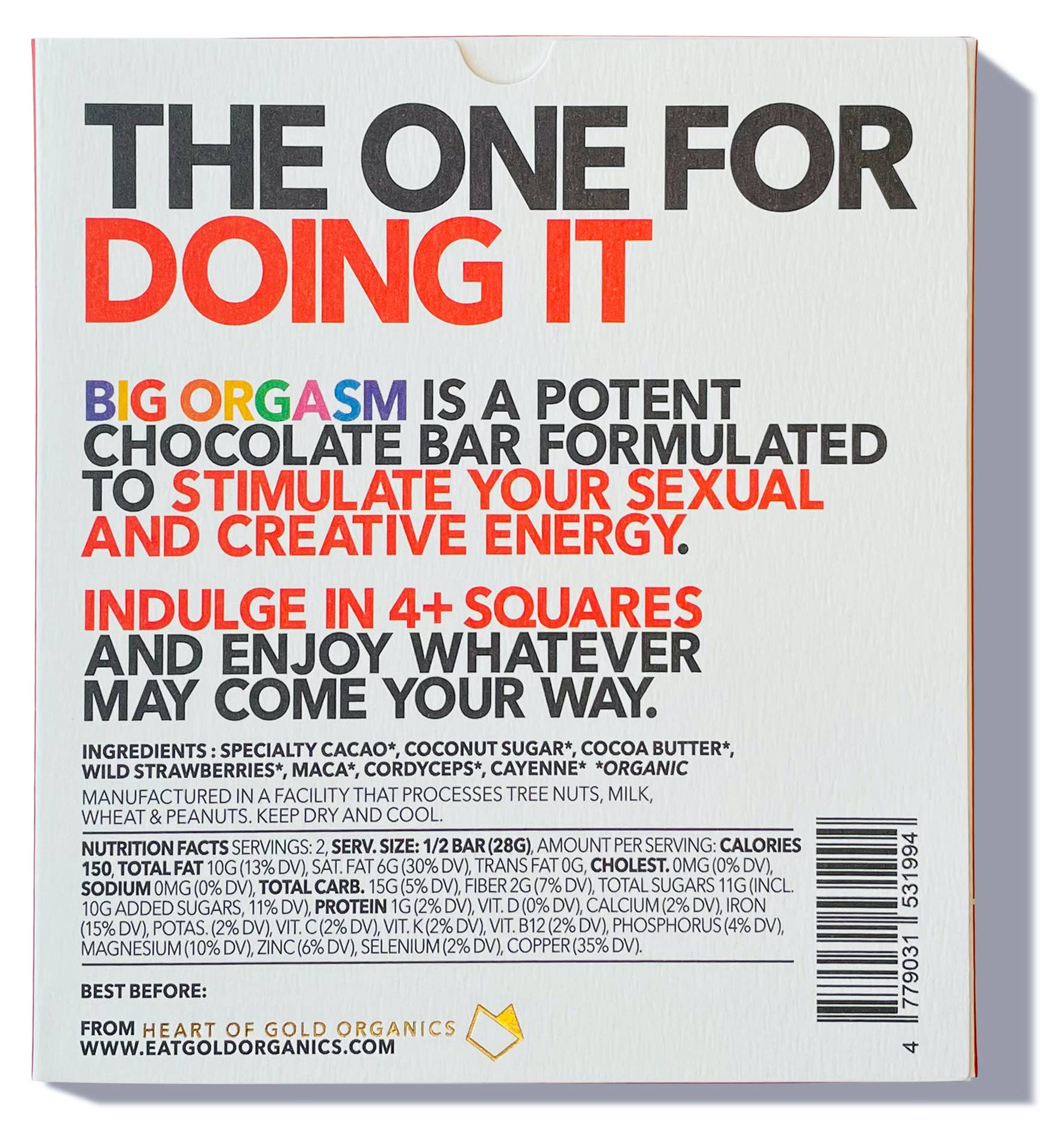 Big Orgasm is a potent, functional chocolate bar formulated to increase libido & stimulate your sexual and creative energy. Indulge in 4+ squares and enjoy whatever comes your way. "I have to say, I am now addicted to how I feel after eating this bar...I don't know if I'm ever not going to have it in my goodie drawer! My wife whole-heartedly agrees lol." - Tim, TX